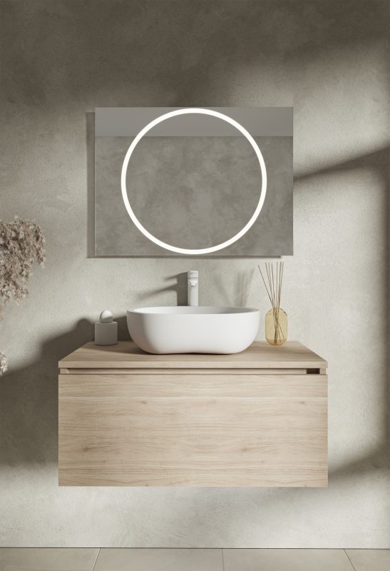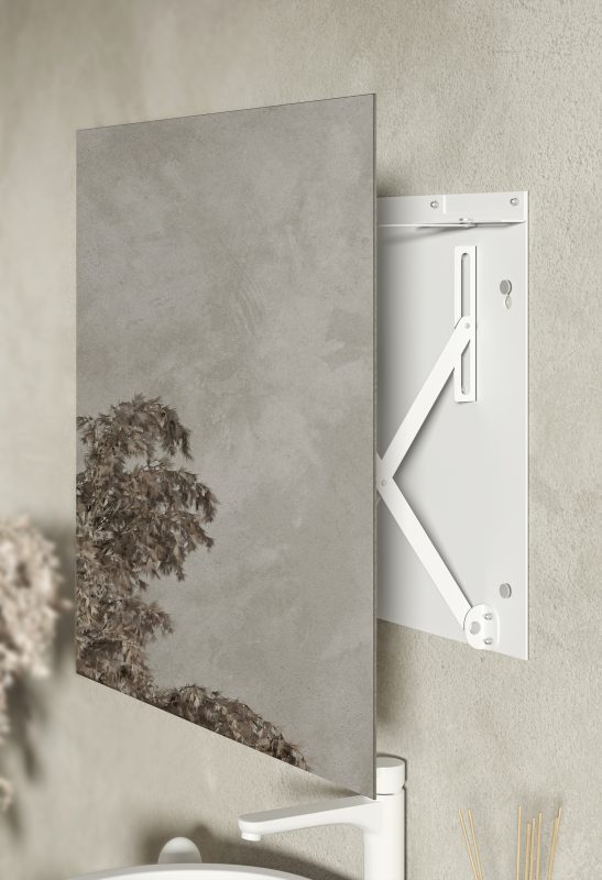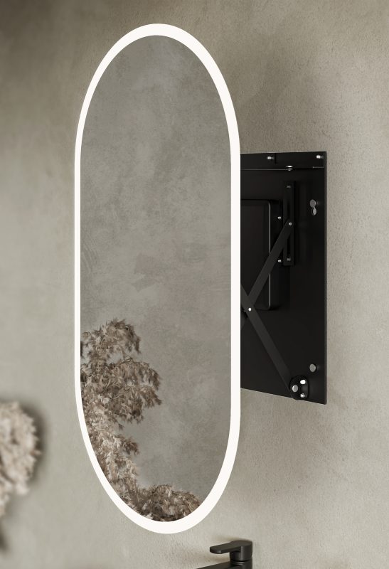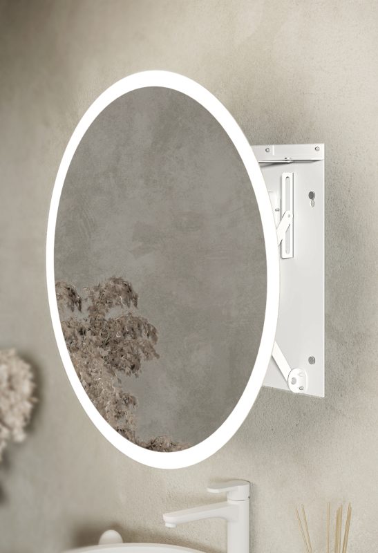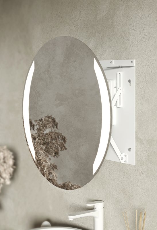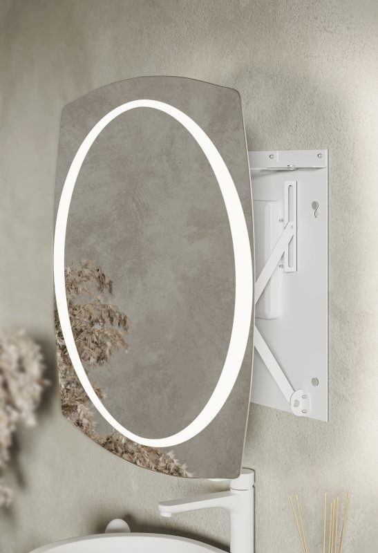 Dzięki opatentowanemu mechanizmowi i unikalnej technologii nasze lustra możesz mieć tak blisko twarzy jak chcesz. Bezgłośnie, intuicyjnie, perfekcyjnie. A miłe oświetlenie LED, włączane automatycznie, idealnie oświetli Twoją twarz.