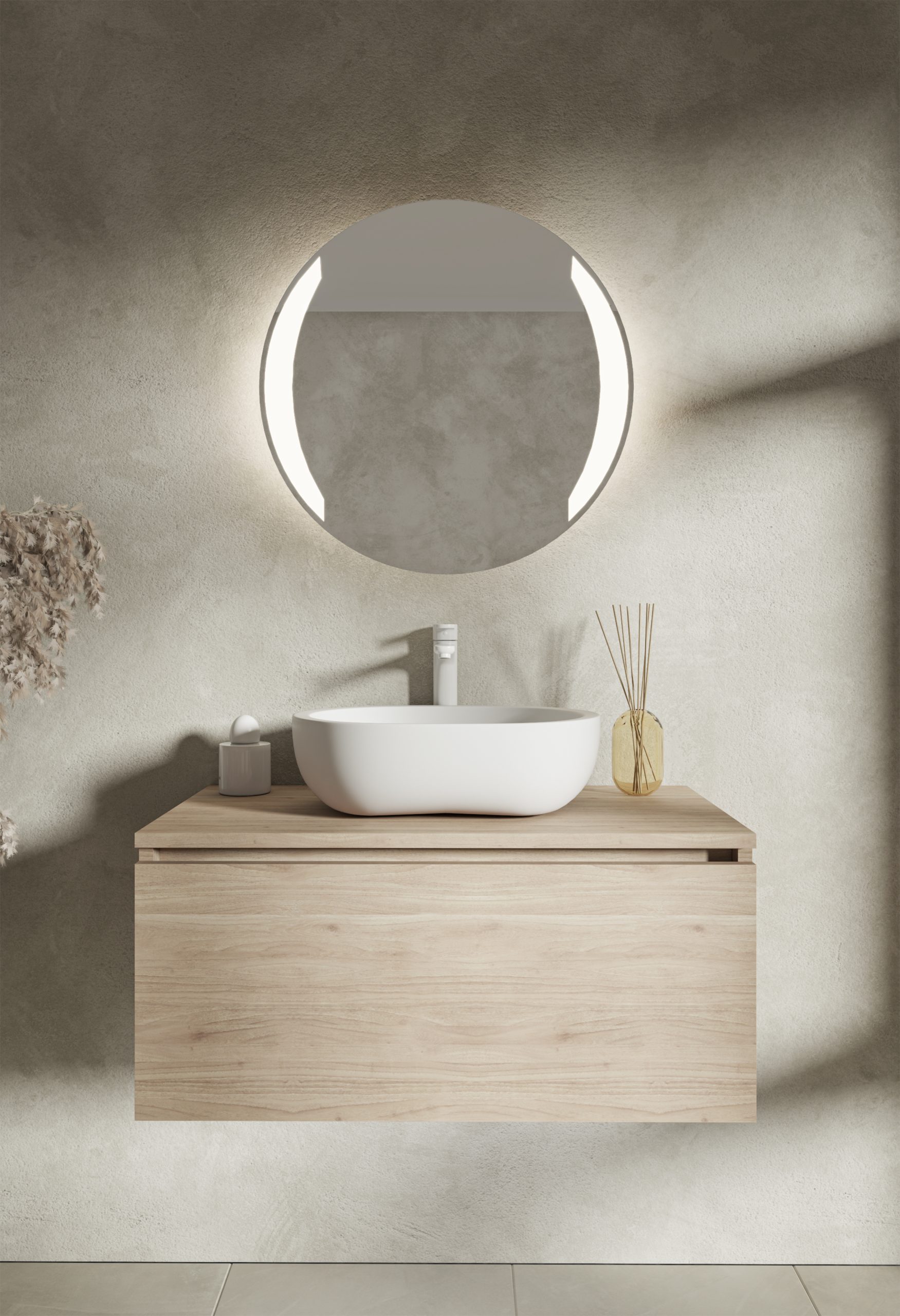 Oświetlenie: LED 4000K w formie dwóch półksiężyców 4000K (świeci zarówno do przodu przez piaskowanie w tafli jak i ambientowo, oświetlając ścianę za lustrem)