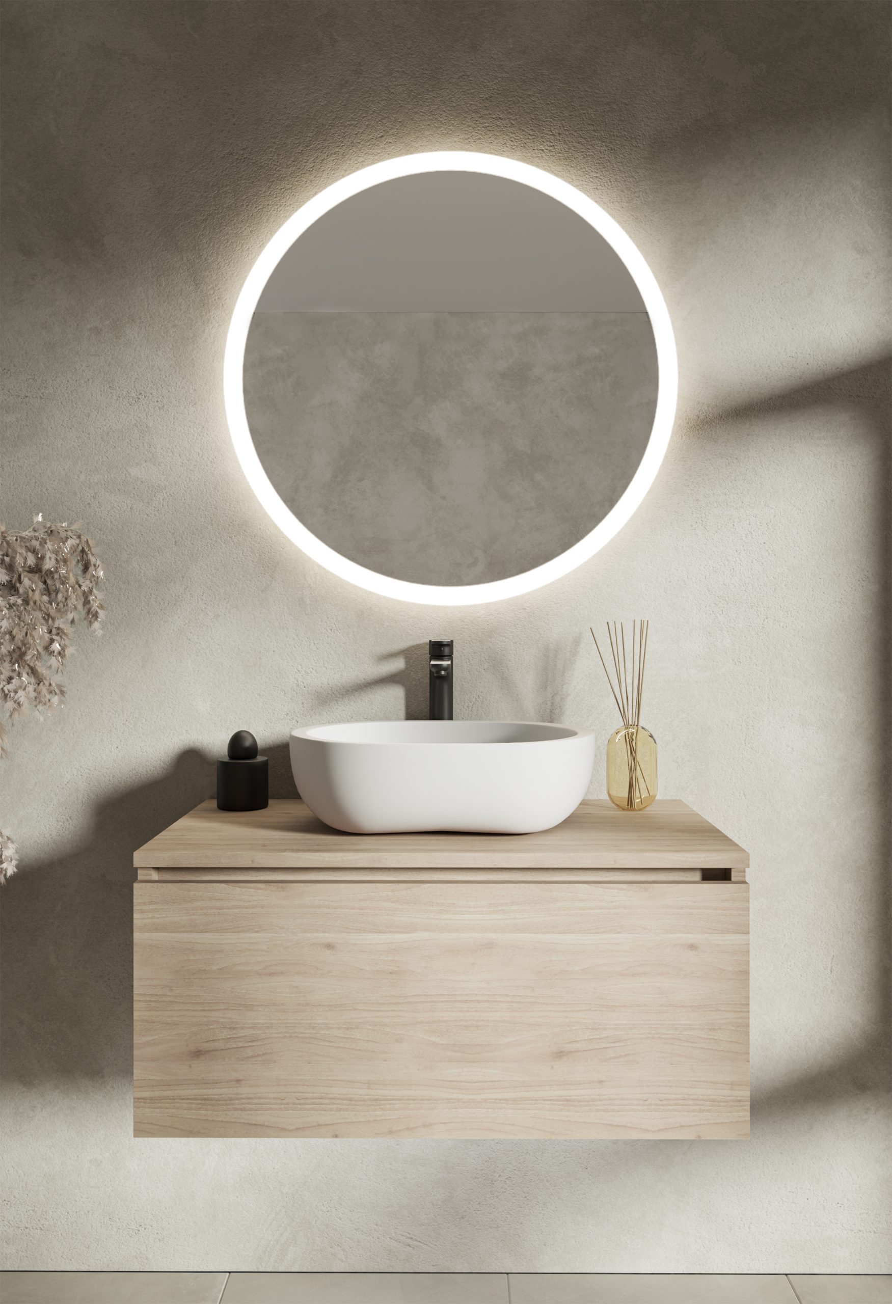 Oświetlenie: LED neutralne 4000K (świeci zarówno do przodu przez piaskowanie w tafli jak i ambientowo, oświetlając ścianę za lustrem)