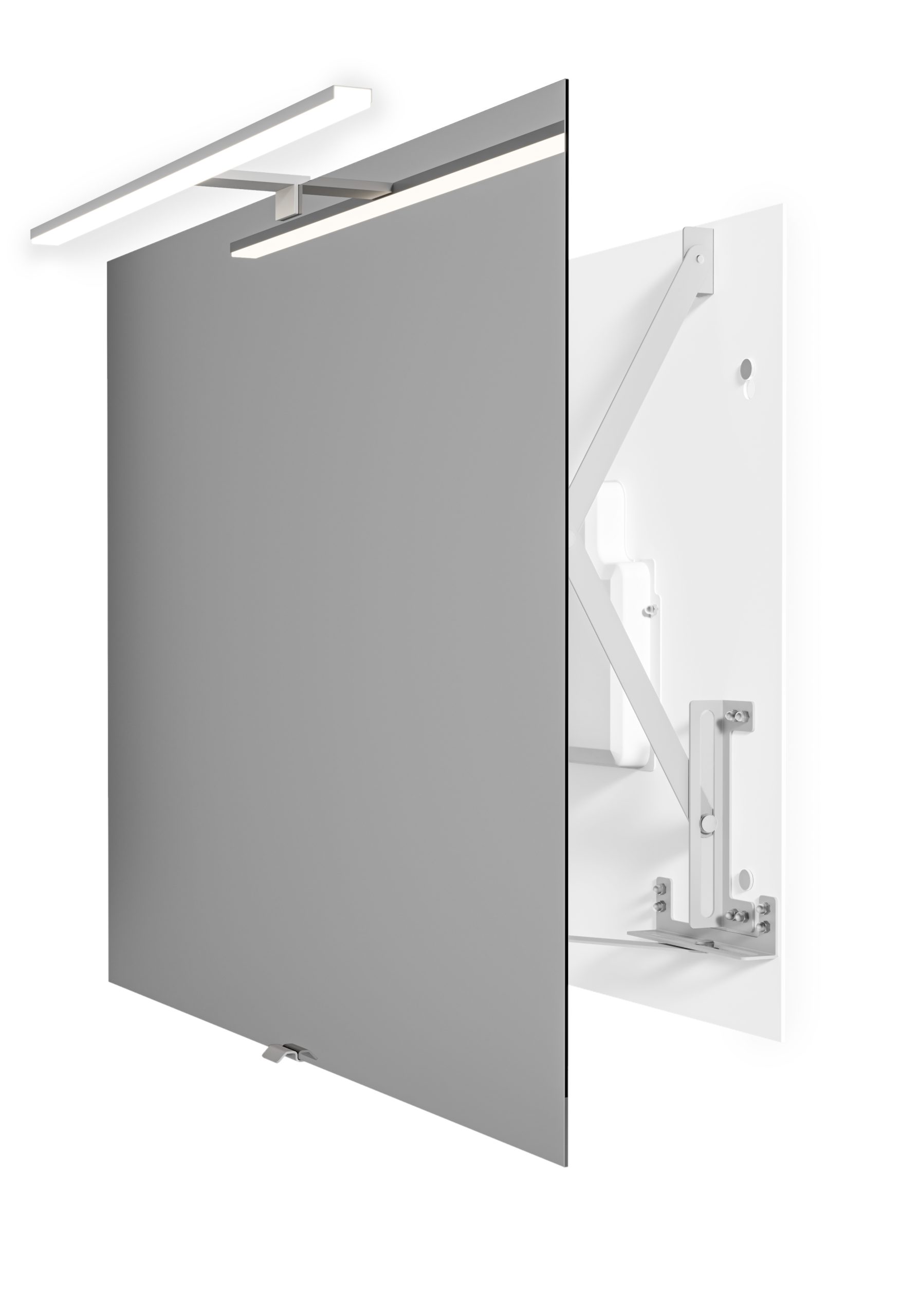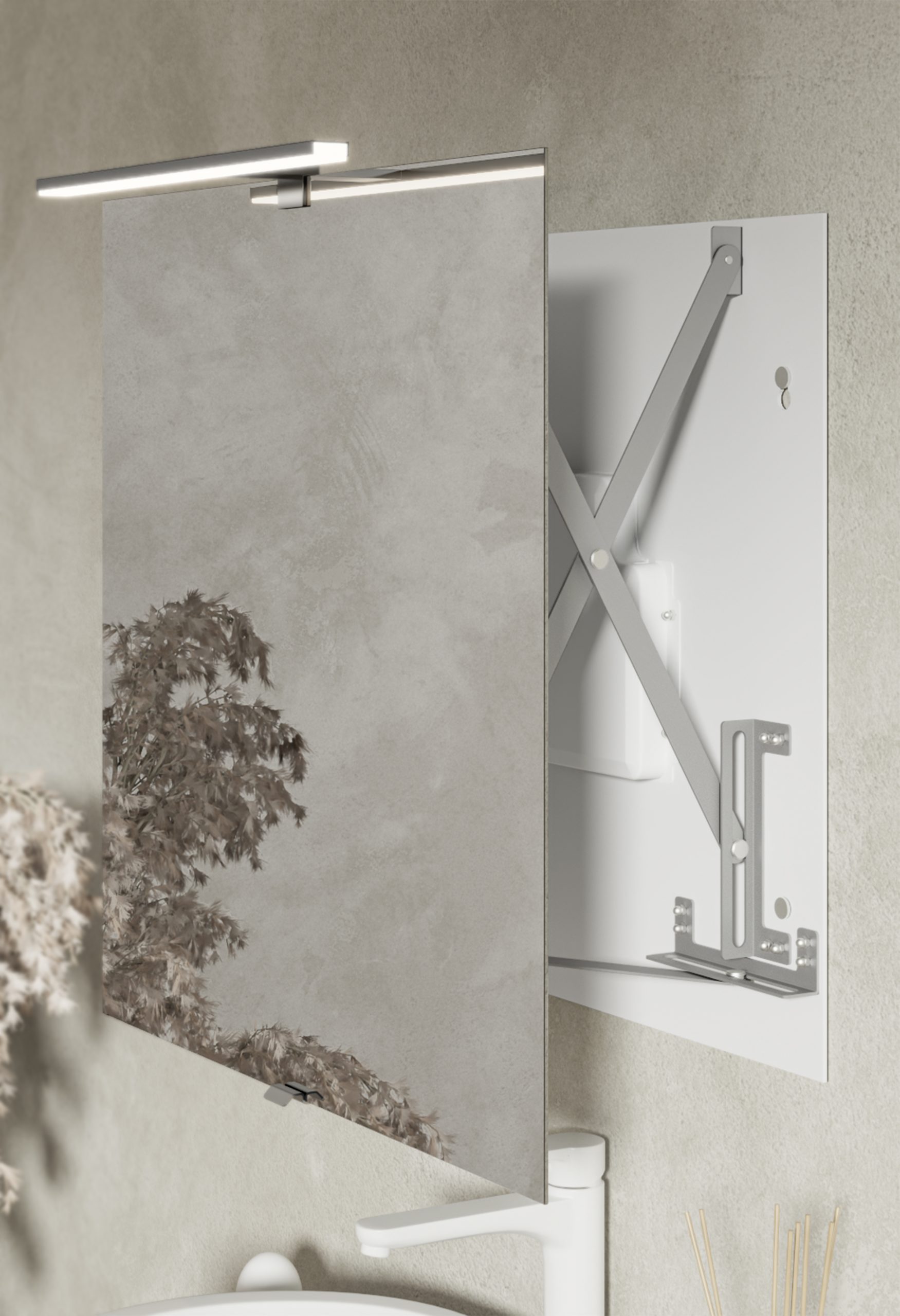 Intuicyjnie i bezgłośnie. Opatentowana konstrukcja mechanizmu i wysokiej jakości, najnowocześniejsze materiały zapewnią Ci komfort na lata. Wysokiej jakości lustro z folią zabezpieczającą, łatwość montażu. Najlepsze z możliwych oświetleniem twarzy dzięki światłu bezpośredniemu i odbitemu od lustra. Jak w studiu aktorskim.