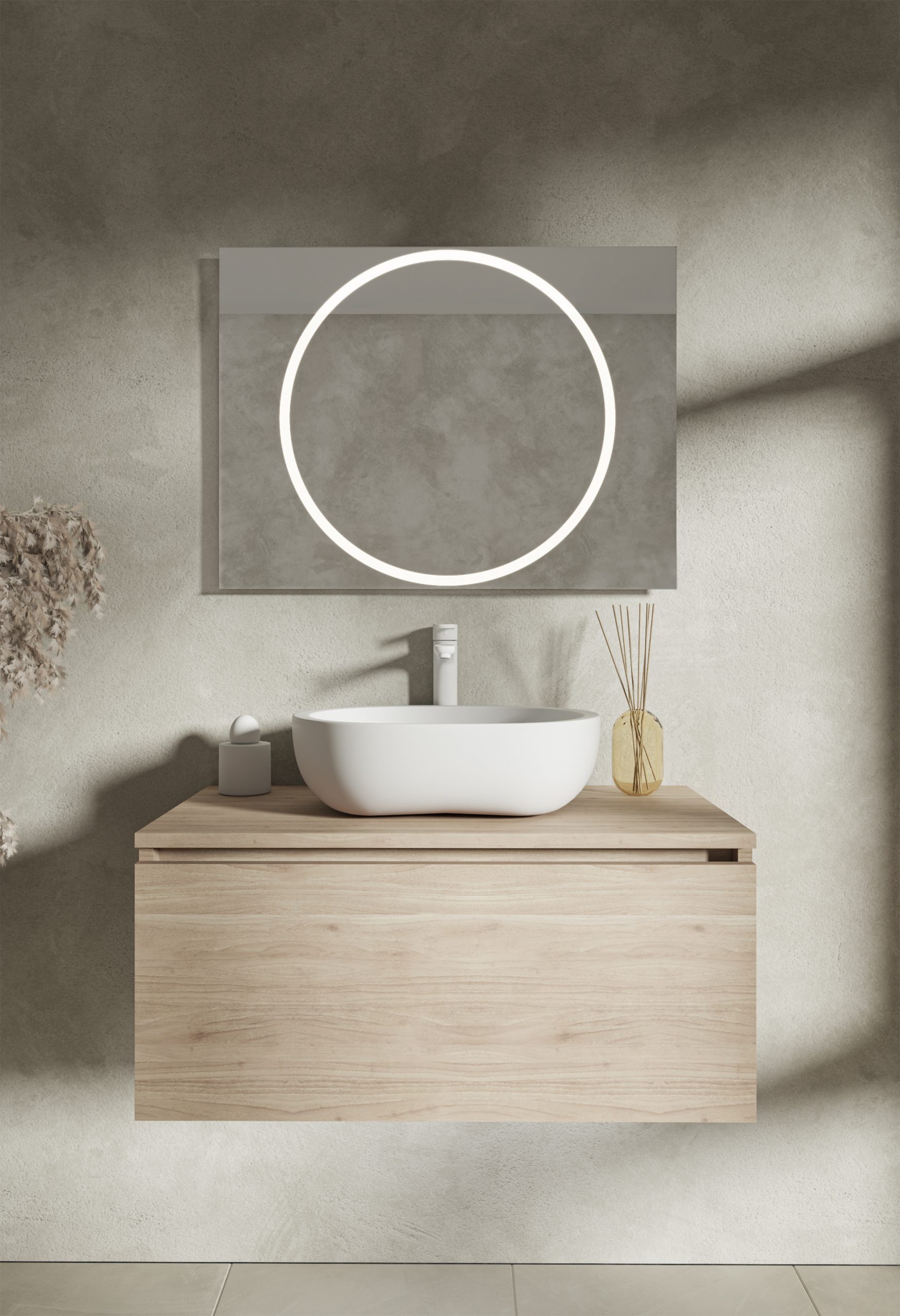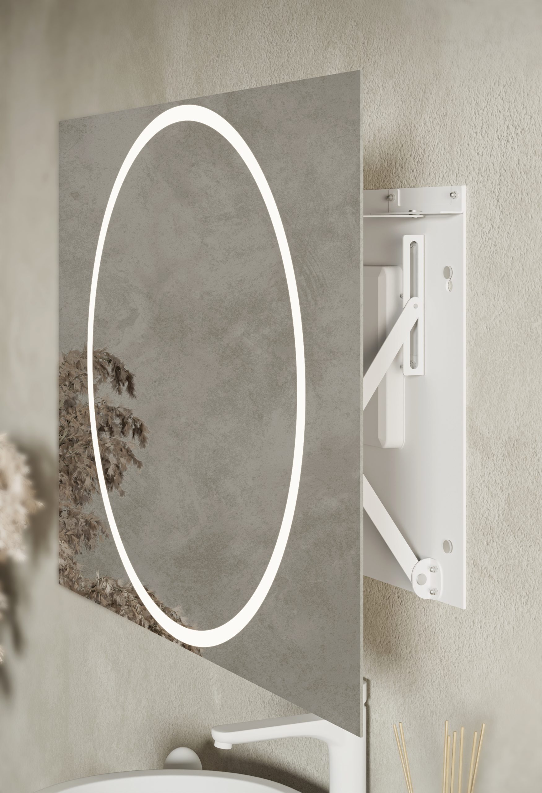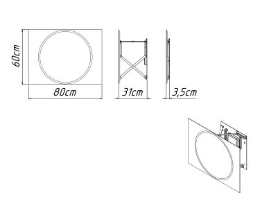Oświetlenie: LED neutralne w formie okręgu 4000K (świeci zarówno do przodu przez piaskowanie w tafli jak i ambientowo, oświetlając ścianę za lustrem)