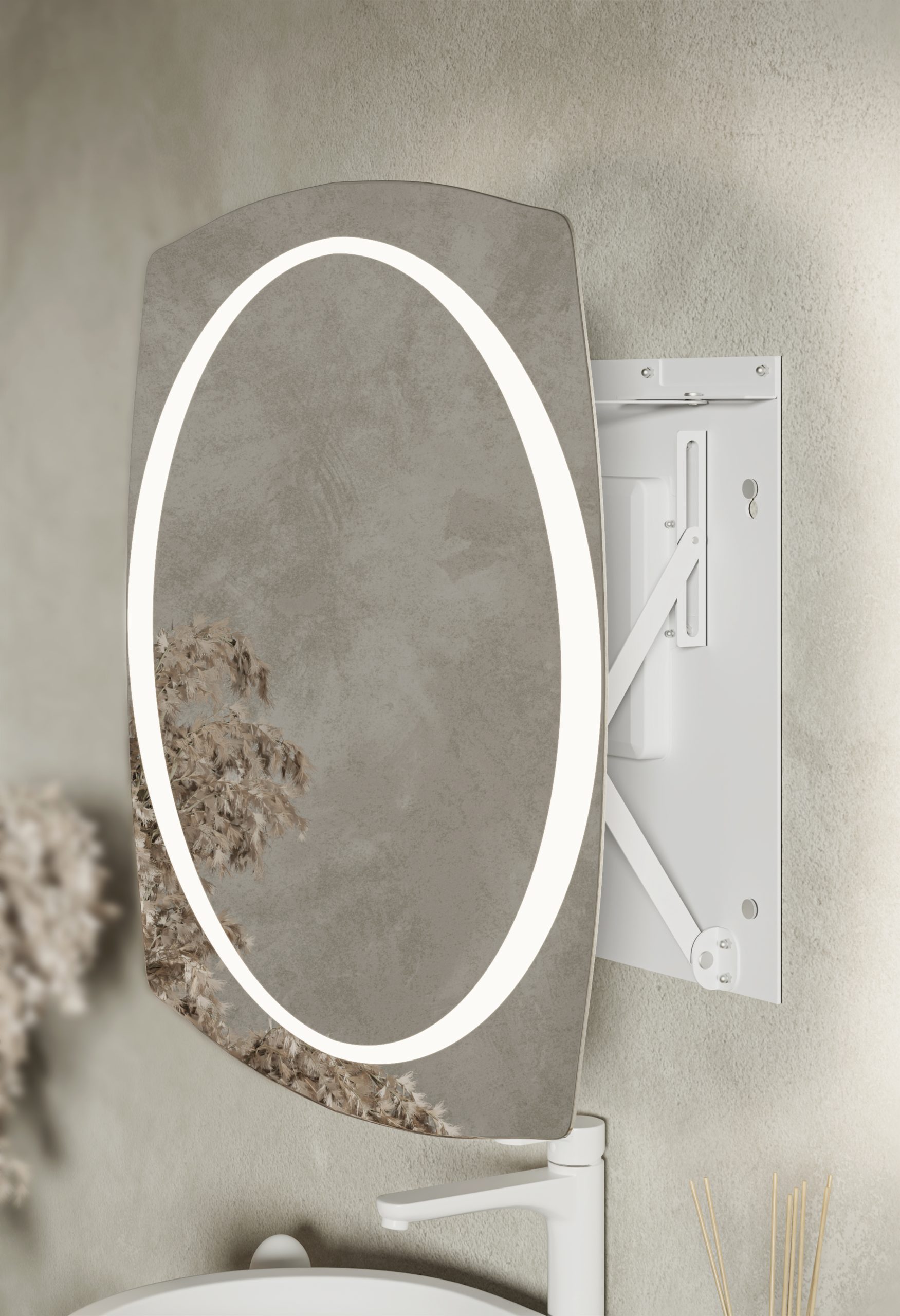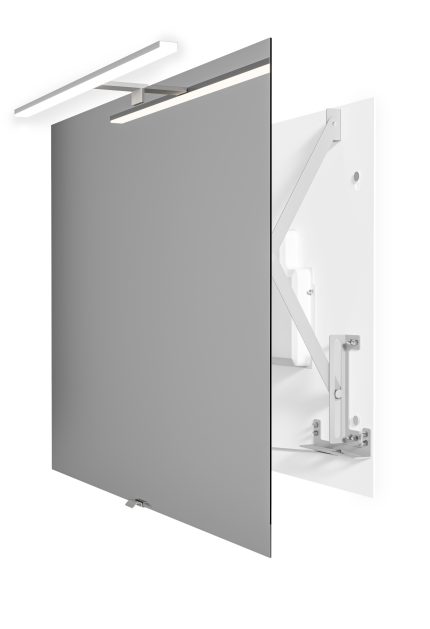 Unikalne, stylowe lustro w formie oka z mechanizmem wysuwnym AXIO-LINK® 2.0 ostatniej generacji. Oświetlenie LED w kształcie elipsy z opcją automatycznego włącznika przy wysuwie (włącza światło po wysunięciu lustra i wyłącza po dosunięciu z powrotem do ściany). Niezwykle płaskie, poręczne i wygodne przy makijażu czy goleniu.