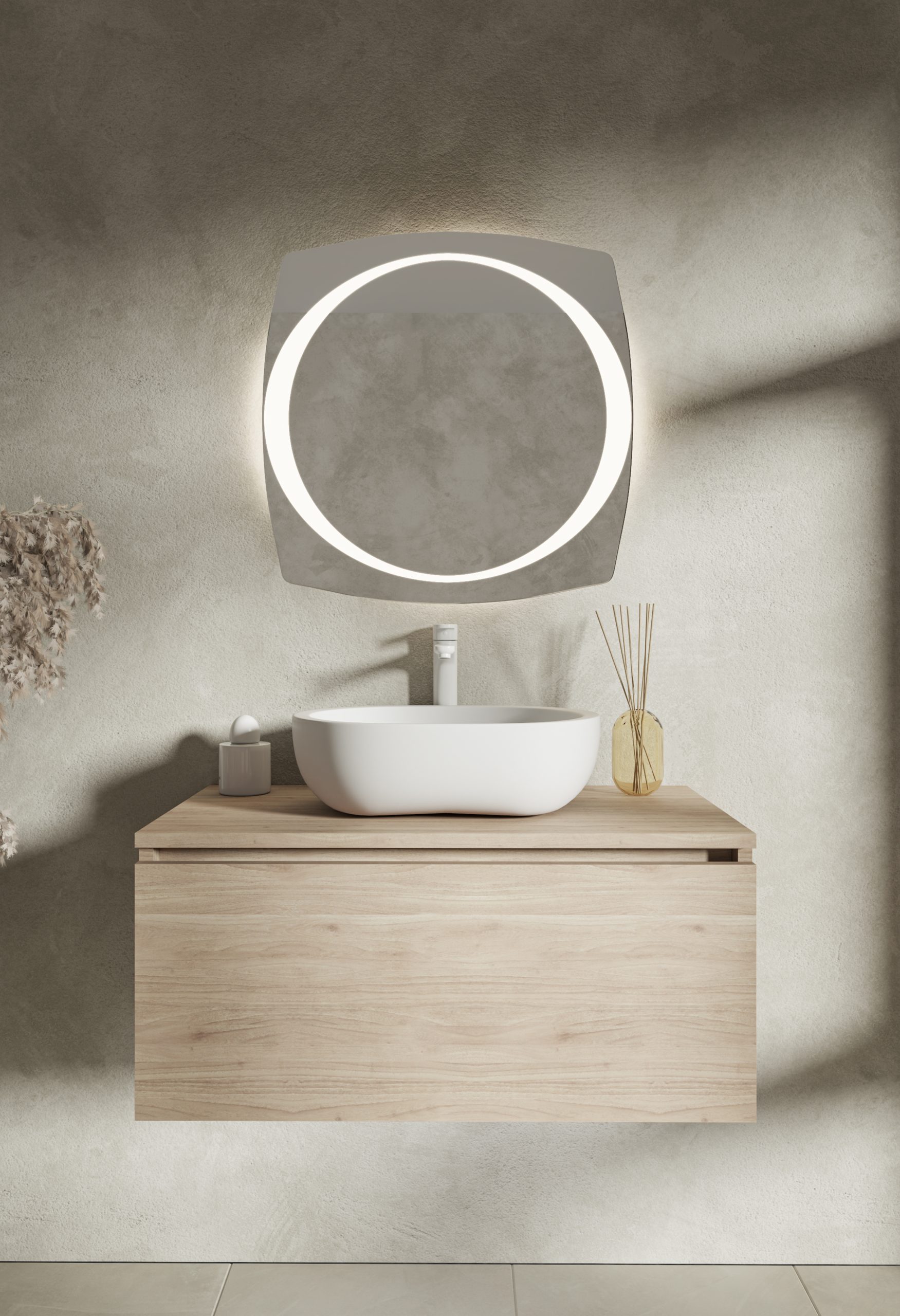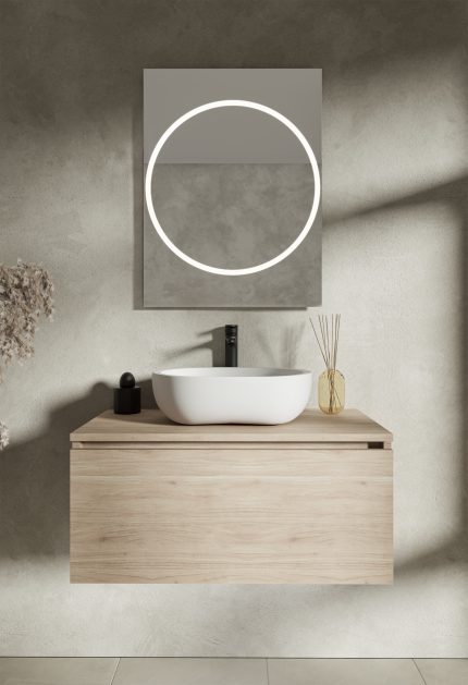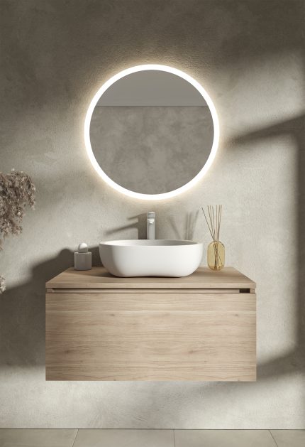 Oświetlenie: LED neutralne 4000K w formie okręgu 4000K (świeci zarówno do przodu przez piaskowanie w tafli jak i ambientowo, oświetlając ścianę za lustrem)